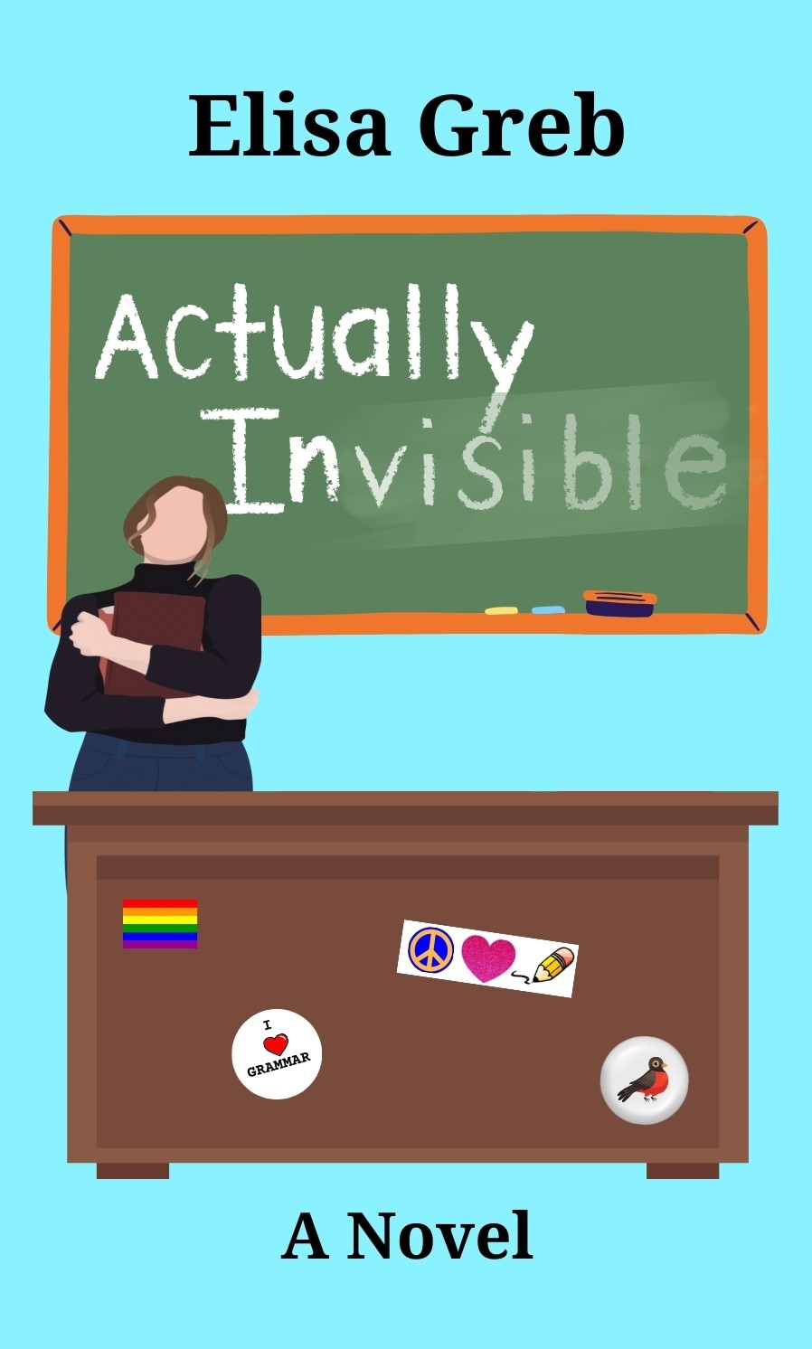Hello! My name is Elisa Greb. On April 1st, 2024, I published my first novel, which details the fictional account of a closeted high school English teacher (Josie) who is falsely accused of influencing a student to be gay. It’s called Actually Invisible and is available through most online retailers that sell books—and soon will be available through library networks, too!
